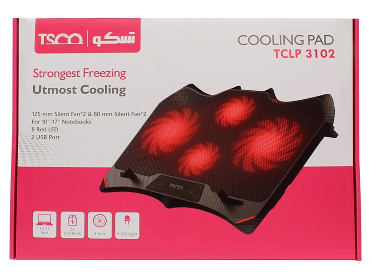 پایه خنک کننده یا کول پد «TCLP 3102» محصولی از شرکت «تسکو» است که میتواند به خوبی میتواند اقدام به کاهش دمای لپتاپ کند. این کول پد به درگاه USB لپ تاپ متصل میشود و دارای دو فن 125 میلیمتری و 2فن 80 میلیتری است. وجود این چهار فن در این کول پد باعث ایجاد جریان هوای خنک و خروج راحتتر هوای گرم لپ تاپ میکند. با توجه به ابعاد TCLP 3102، این کول پد میتواند لپتاپهای تا سایز 17 اینچ را پشتیبانی کند. سرعت چرخش در فنهای TCLP 3102 برابر با 1500 دور بر دقیقه است. شرکت تسکو برای زیبایی بیشتر 8 عدد نشانگر LED روی این کول پد تعبیه کرده است. برای جبران درگاه USB لپ تاپ اشغال شده برای اتصال این کول پد، شرکت تسکو دو پورت USB روی آن قرار داده است. جنس کول پد تسکو مدل TCLP 3102 ترکیبی از فلز و پلاستیک است که این موضوع باعث مقاوم آندر برابر ضربات است. کول پد TCLP 3102 انرژی مورد نیاز خود را از طریق درگاه USB لپ تاپ تامین میکند.